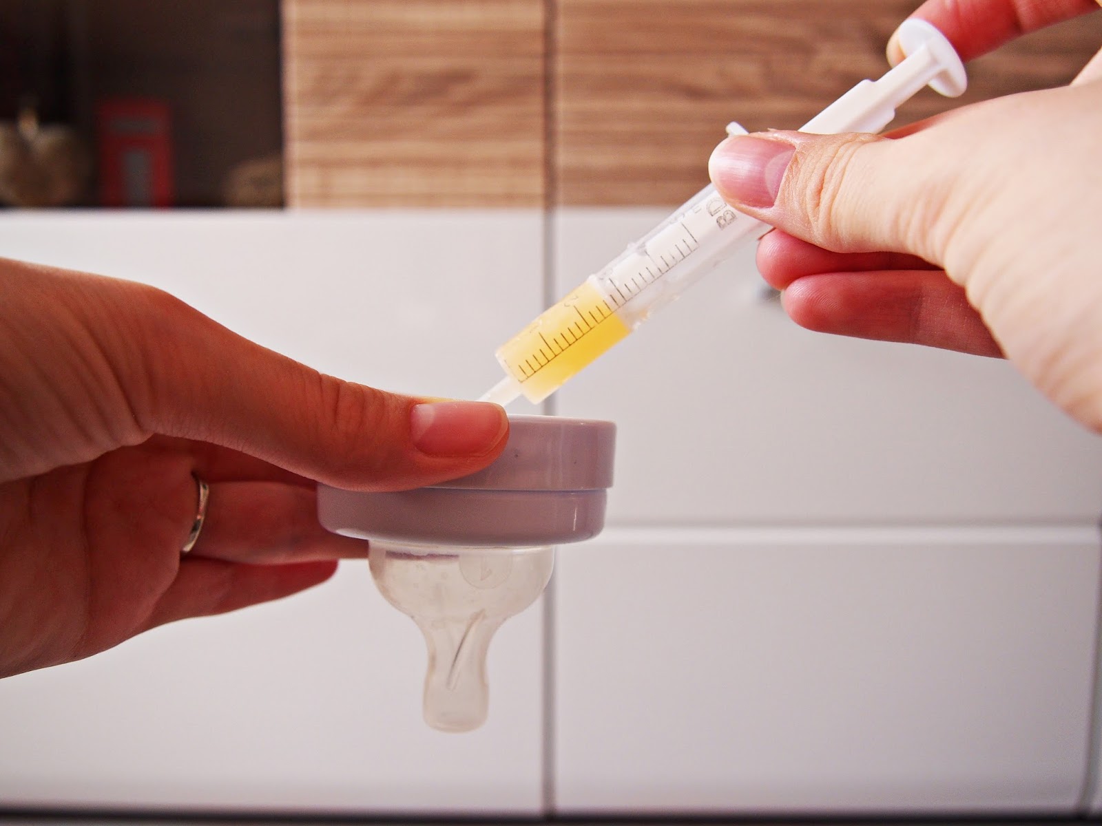 - odmierzoną ilość syropku wciskamy ze strzykawki do smoczka