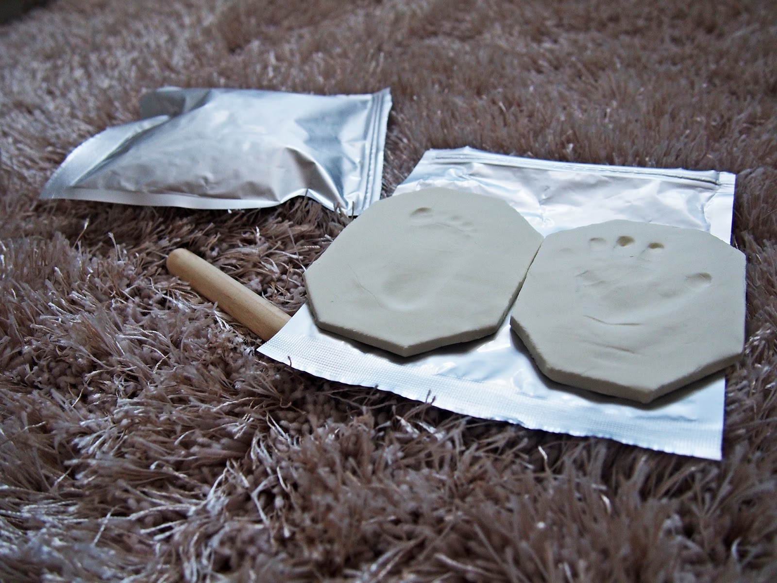 Żeby wykonać odcisk, trzeba się nieco napracować. Trzeba delikatnie ale porządnie przycisnąć rączkę dziecka bo inaczej akcję należy powtórzyć bo nie będzie nic widać. Najlepiej zatem wykonać to zadanie jak dziecko śpi. Nie będzie się wtedy kręcić i płakać. Maleństwo nie lubi niestety wymyślnych wariactw mamusi 😀 Masę wyjmujemy z woreczków, ugniatamy, formujemy i kładziemy na deseczkę pokrytą np folią aluminiową. Następnie wałkujemy tak, żeby forma miała 5 cm grubości i była równa.