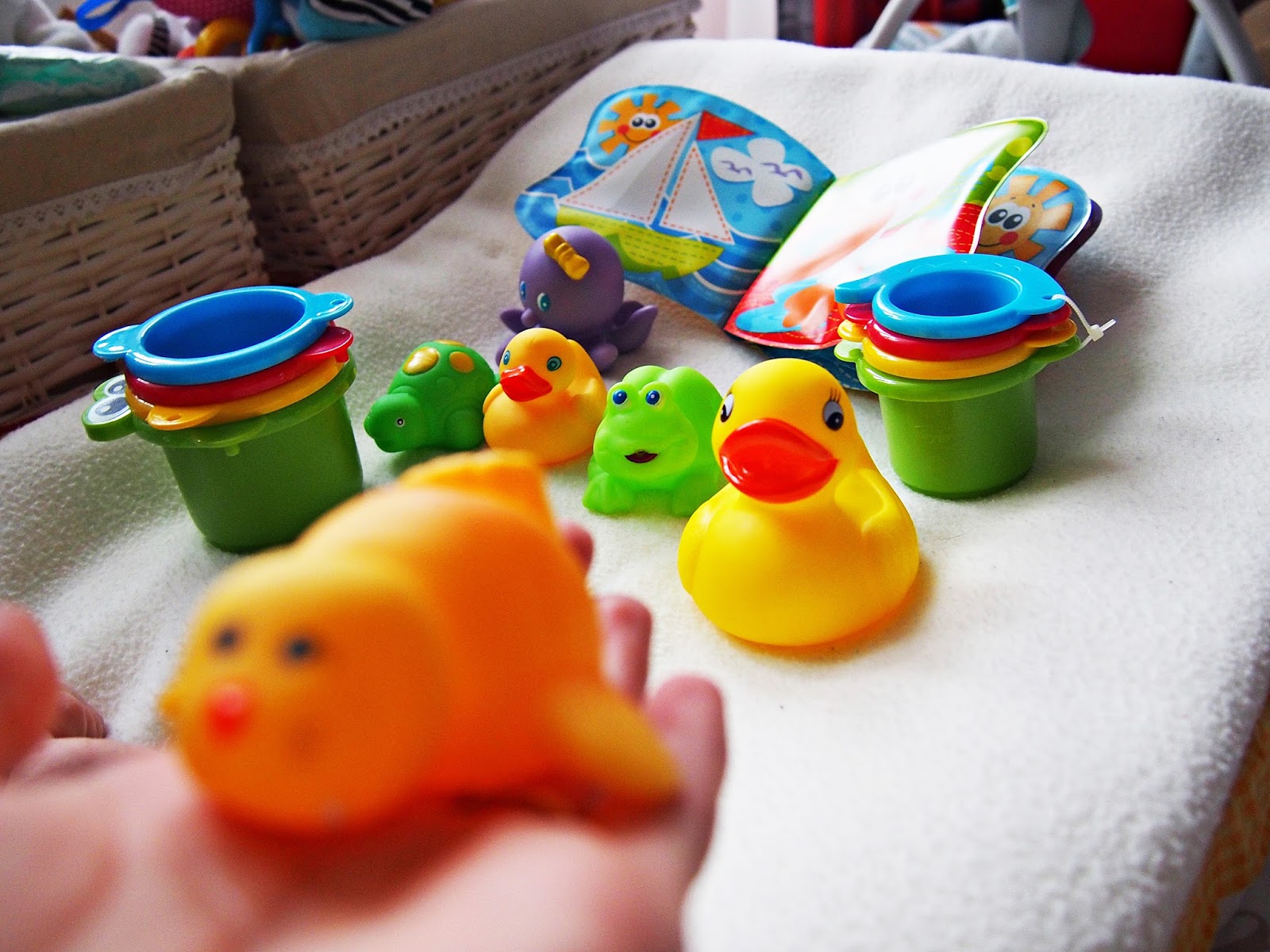 własne zabawy w kąpieli. Dla mnie czas wtedy zatrzymywał się i mogłam siedzieć w ciepłej wodzie godzinami. Cała masa zabawek – niekoniecznie typowo do kąpieli – pozwalała mi na uruchamianie machiny wyobraźni. W wannie mogłam siedzieć sama długi czas wymyślając różne mikstury i scenariusze zabaw. Obecnie mamy tak szeroki wybór przedmiotów do kąpieli, że nie sposób je wszystkie wymienić. Osobiście polecam dosyć tanie zestawy do zabawy – kubeczki z dziurkami (dostępne w Tesco) i czadową żabkę znalezioną w typowym sklepie dla dzieci. Niedługo będziemy polować na nowe gadżety – a jest w czym wybierać!