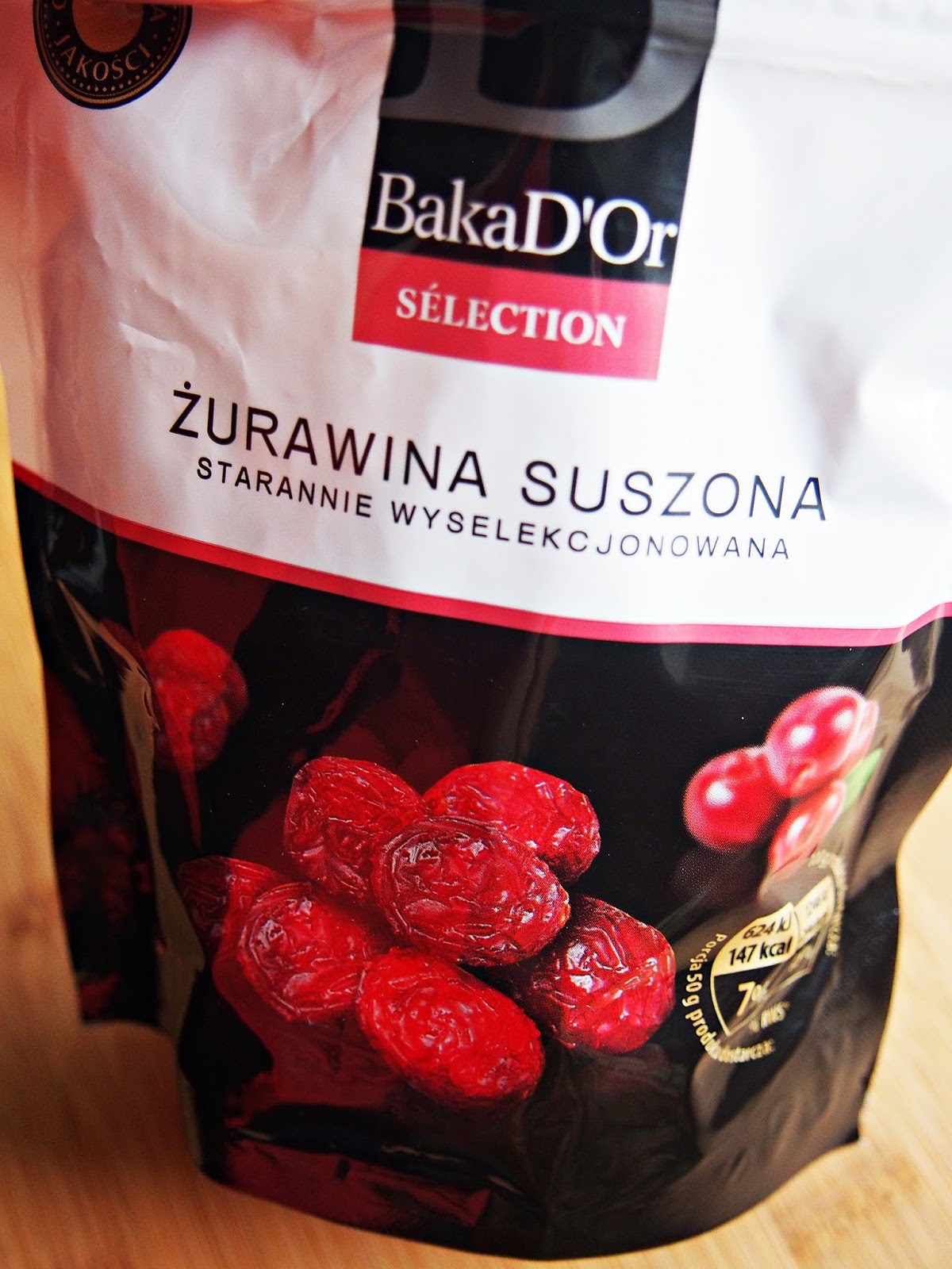 Suszone owoce zawierają mnóstwo witamin. Żurawina jest jednym z najbardziej prozdrowotnych owoców. Polecam ją zdecydowanie kobietom w ciąży – szczególnie zagrożonych zapaleniem układu moczowego i podobnym infekcjom. Suszoną żurawinę kazała mi jeść moja położna, a nawyk ten pozostał mi do dziś. Migdały natomiast jadłam od dawna. Uwielbiam ich smak i zapach. Jeśli jednak za nimi nie przepadasz, spokojnie można je zastąpić suszonymi morelami. Te dodatkowo regulują ciśnienie krwi i pracę nerek, oraz są polecane przy nadkwasocie.